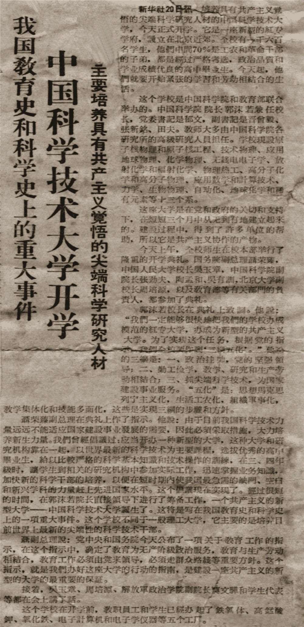1958年9月21日,《人民日报》刊登中国科学技术大学成立暨开学典礼的报道,称中国科大的成立为“我国教育史和科学史的重大事件”。