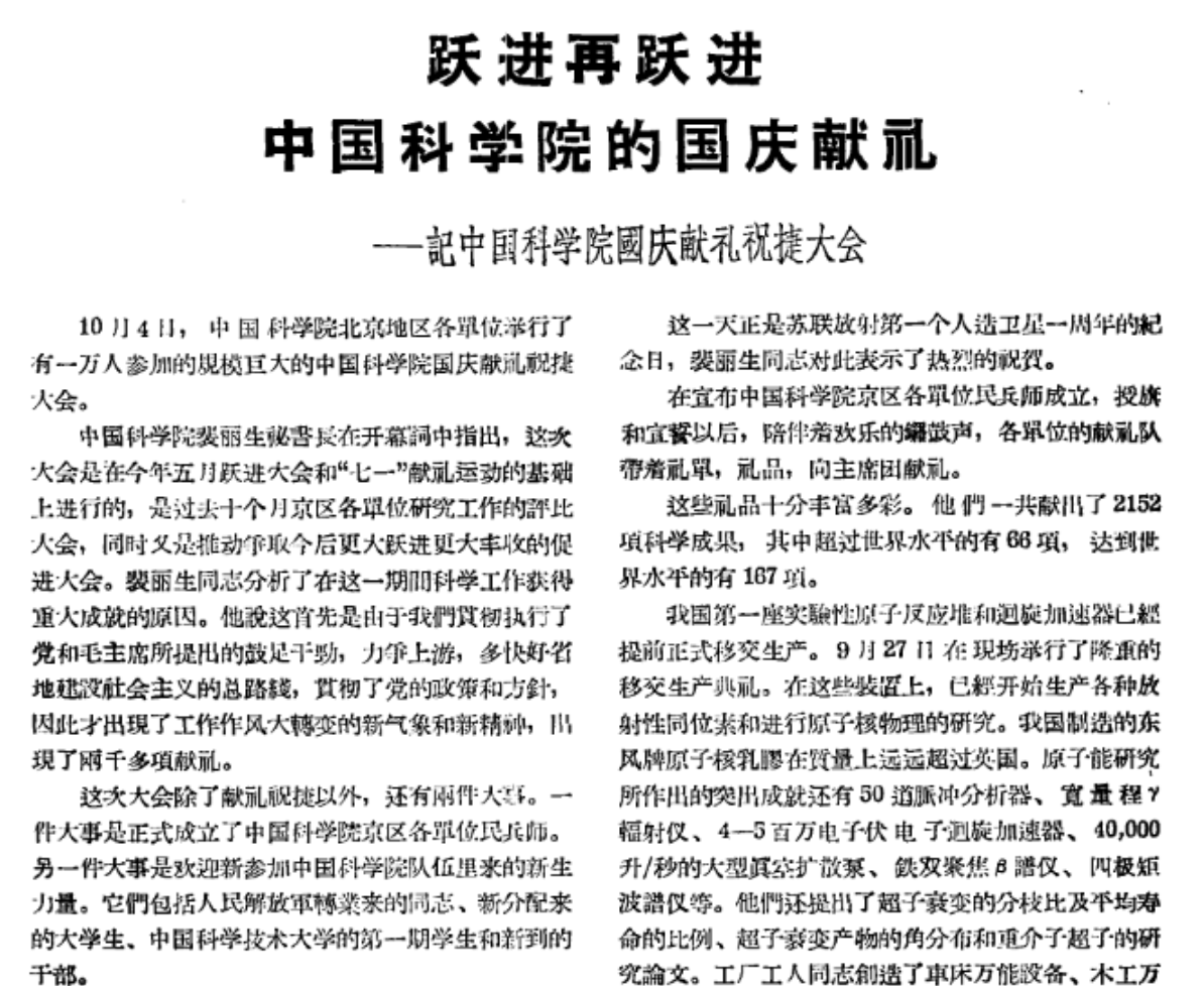 《科学通报》报道中国科学院国庆献礼祝捷大会