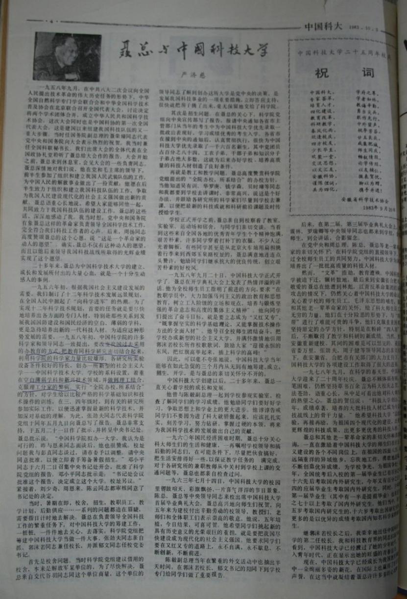 1983年10月5日,严济慈校长在校刊《中国科大》发表《聂总与中国科技大学》文章