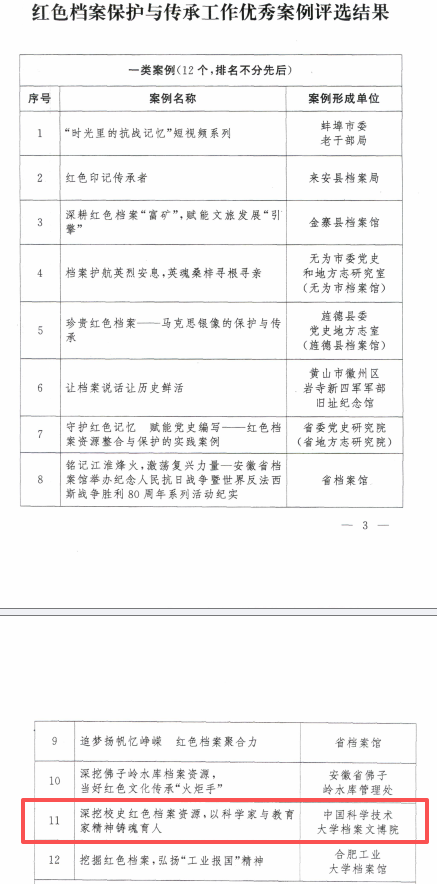 近日,安徽省档案局印发《关于红色档案保护与传承工作优秀案例评选结果的通报》,全省共评选出12个一类优秀案例。其中,我院 “深挖校史红色档案资源,以科学家与教育家精神铸魂育人”案例成功入选。