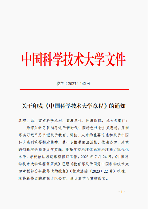 2014年11月19日,学校召开《中国科学技术大学章程》发布会,正式对外公布学校章程。发布会由校党委书记许武主持,校长侯建国出席发布会并讲话。在校领导,校学术、学位、教学委员会,学校所属单位负责人,民主党派、教代会主席团成员,离退休干部以及学生代表参加了发布会。