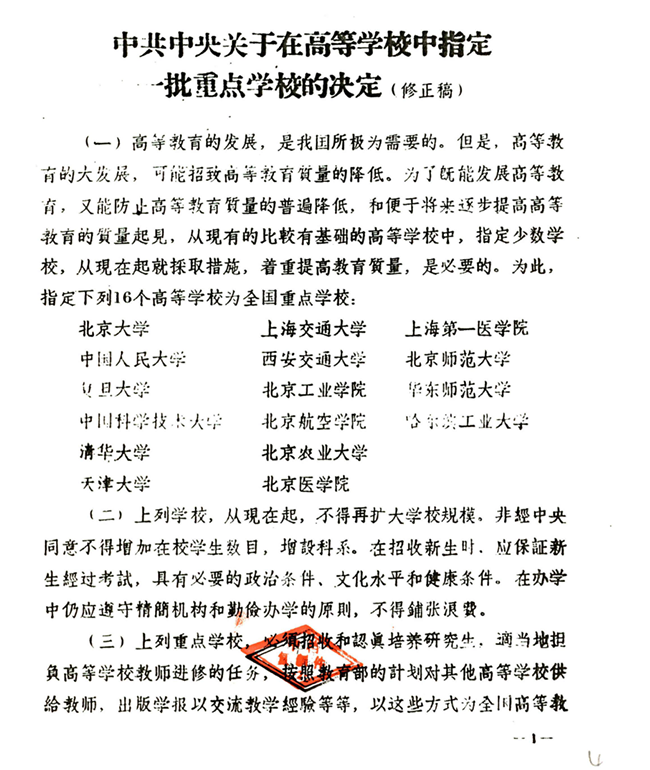 1959年3月22日,中共中央发出《关于在高等学校中指定一批重点学校的决定》。指定北京大学、中国人民大学、复旦大学、中国科学技术大学、哈尔滨工业大学、清华大学等16所高等学校为全国重点学校。
