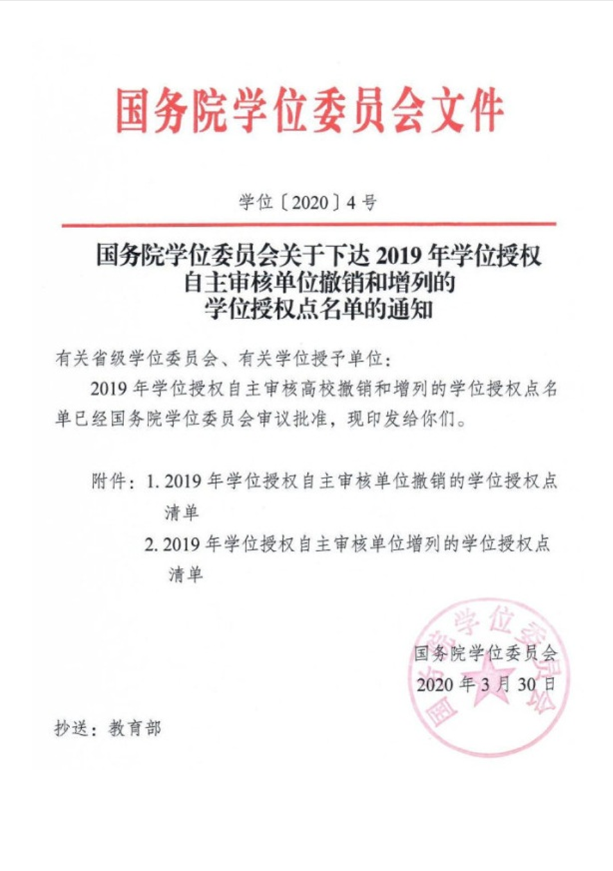 2020年3月30日,国务院学位委员会下达2019年学位授权自主审核单位学位授权点名单