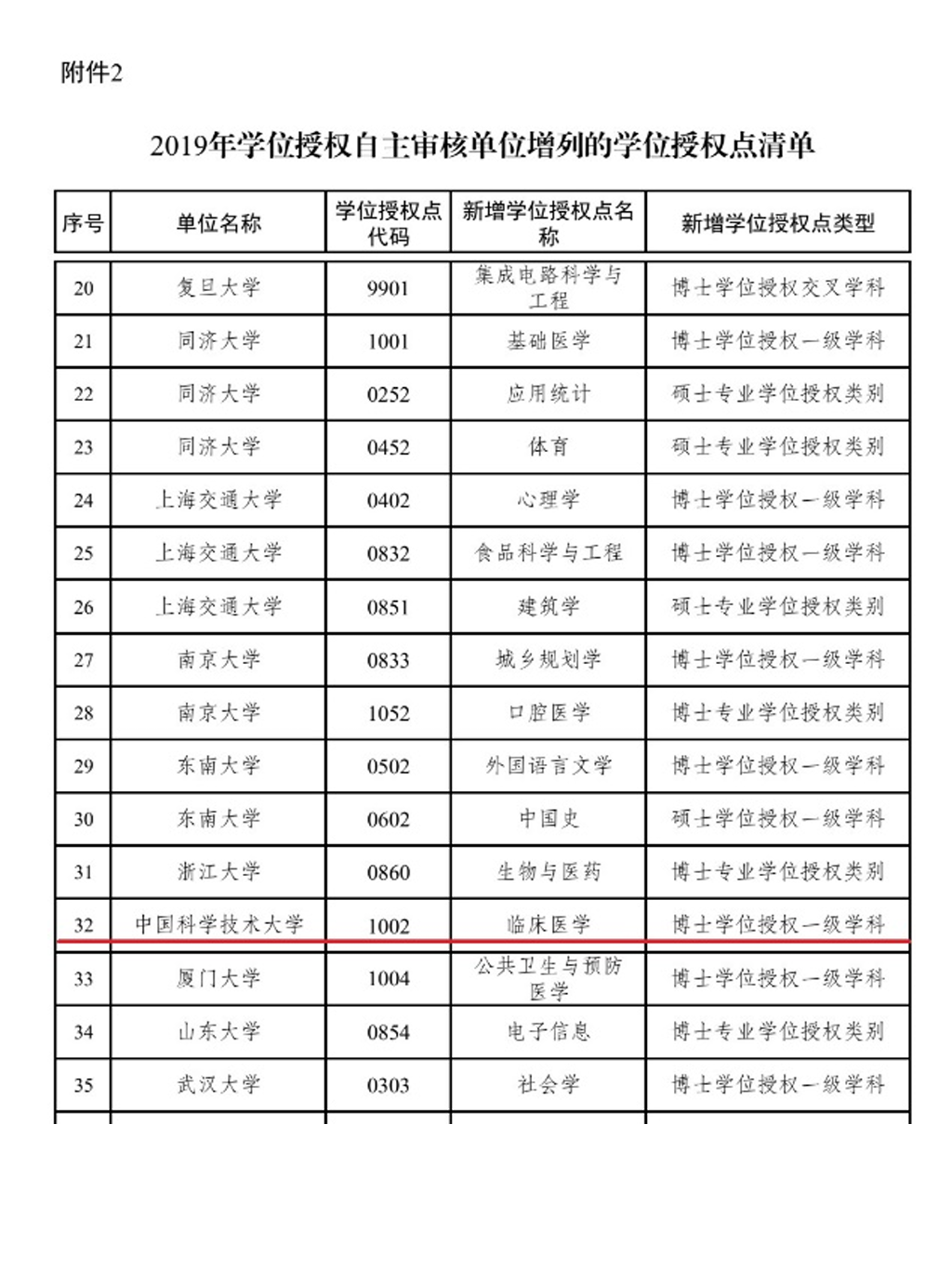 2020年3月30日,国务院学位委员会公布2019年学位授权自主审核单位增列学位授权点名单,批准中国科学技术大学自主审核增列的临床医学一级学科博士学位授权点和动态调整增列的马克思主义理论一级学科硕士学位授权点。