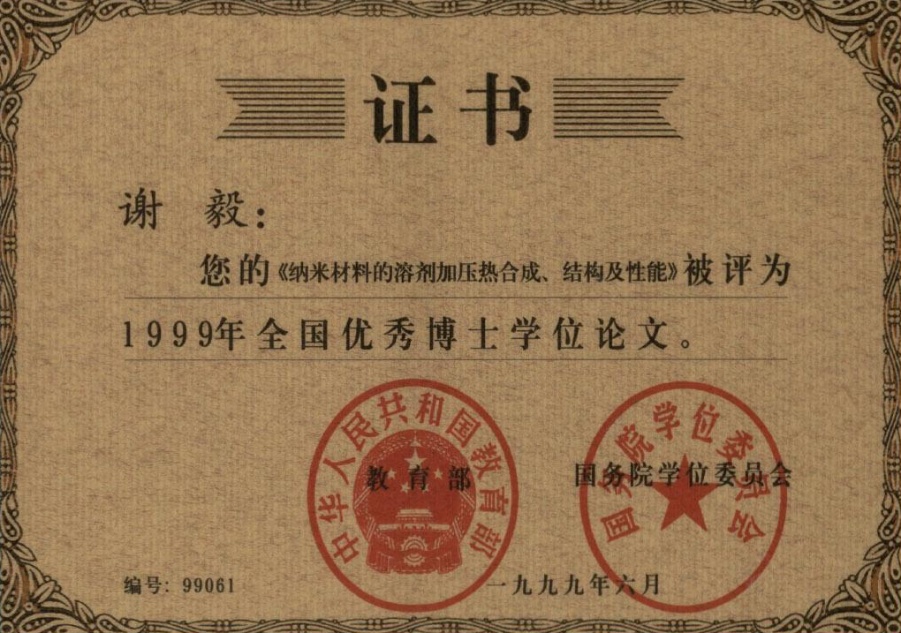谢毅博士的学位论文《纳米材料的溶剂加压热合成、结构及性能》获1999年全国优秀博士学位论文