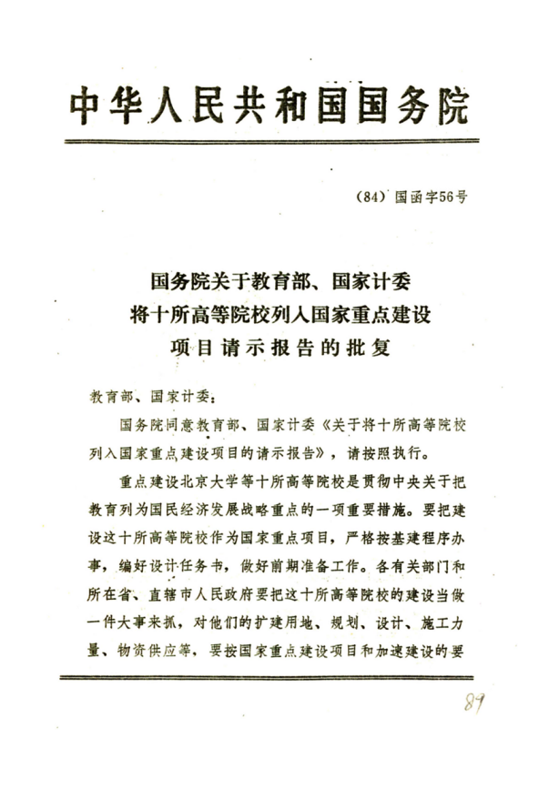 国务院批复教育部、国家计委,同意将中国科学技术大学等十所高等院校列为“七五”期间国家重点建设的10所大学。