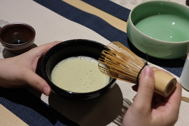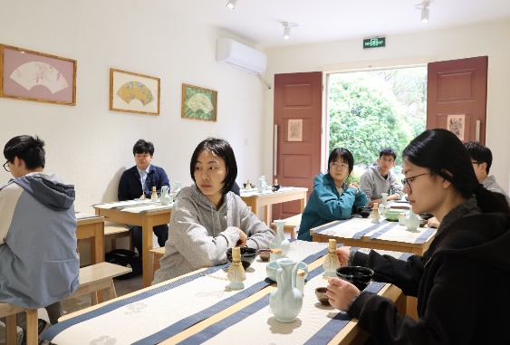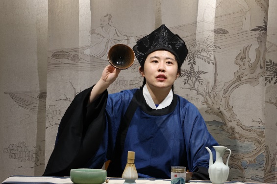 活动伊始,身着传统服饰的指导老师以宋徽宗《大观茶论》为引,结合建盏、茶筅等复原器物,细述宋代点茶的源流与精神。随后的演示环节,茶筅飞旋,茶末与水在盏中交融幻化,渐成绵密持久的“云头雨脚”,乳白沫渤如积云堆雪,引得在场同学赞叹不已。