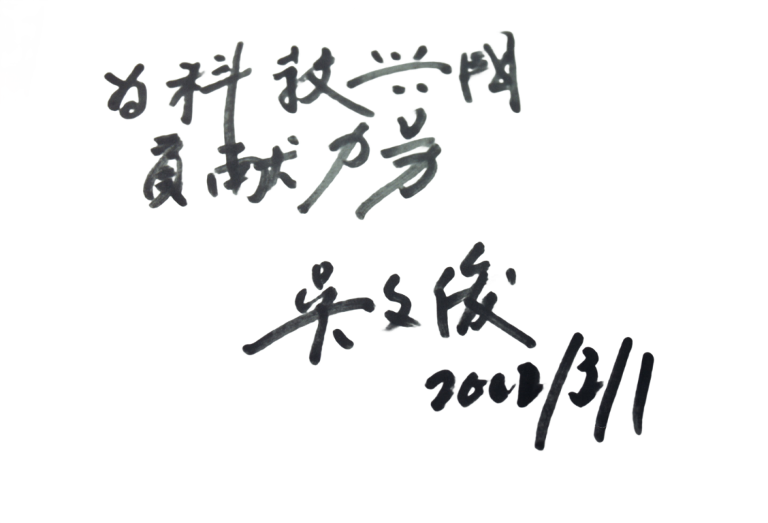 这份题词手迹出自我国首届国家最高科学技术奖得主、中国科学技术大学数学系原副主任吴文俊院士之手。“为科教兴国贡献力量”,既是吴文俊本人从事科学研究与教育事业的毕生追求,更是他对中国科大全体师生的期待和对中国科大未来发展的展望。