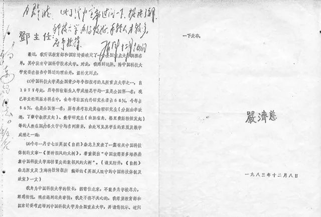12月14日,邓小平在严济慈校长的信笺上批示:“据我了解,科技大学办得较好,年轻人才较多,应予扶持”。国务院副总理万里也对此批示:“请东昌(时任教育部部长)同志再研究一下,科大应给予应有的支持。请与科学院研究。”由此,中国科大进入国家“七五”期间重点建设高校行列。