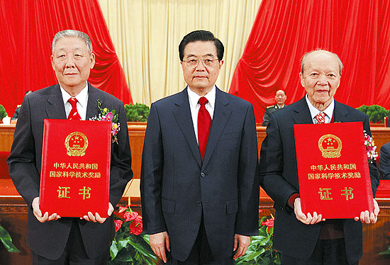 中共中央总书记、国家主席、中央军委主席胡锦涛向获得2009年度国家最高科学技术奖的中国科学院院士谷超豪(右)、孙家栋(左)颁奖