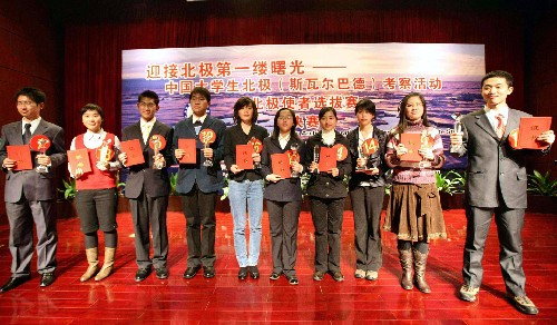 10名入选中国大学生北极考察队的大学生被授予“北极使者”称号(左二为钟楠同学)