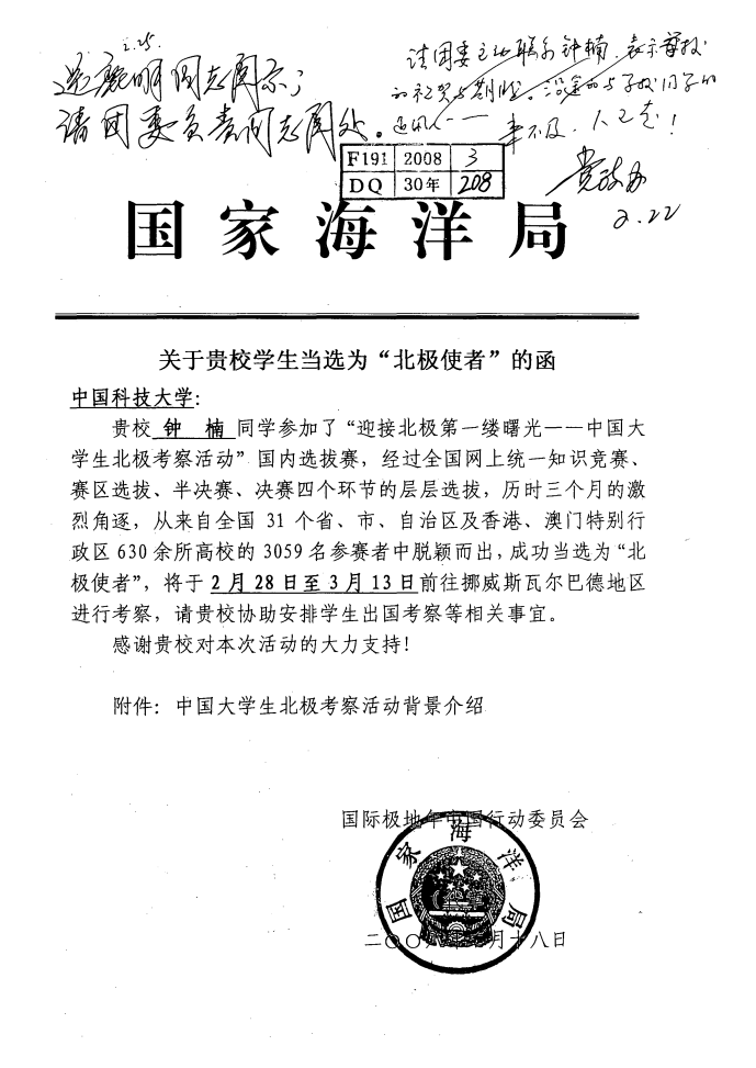 2008年1月16日,中国科大生命科学学院钟楠同学当选国家海洋局“北极使者”